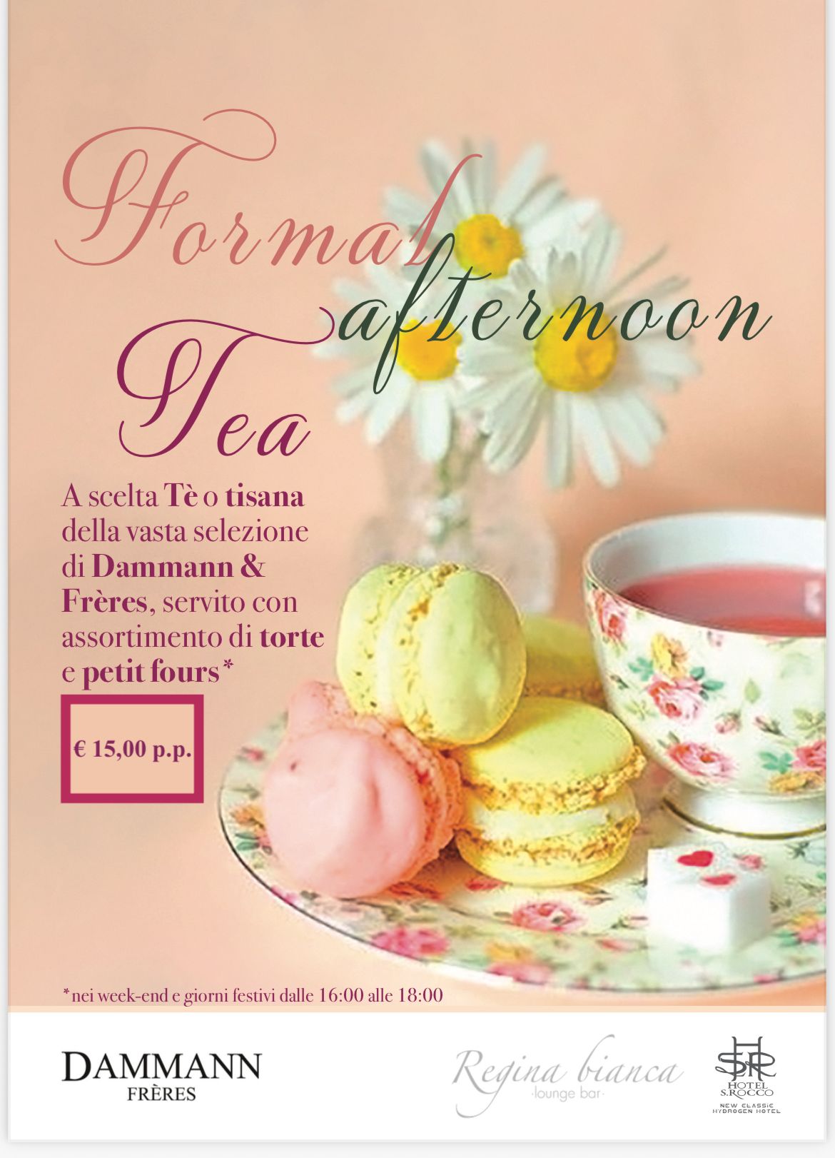 Format Afternoon Tea al Regina Bianca Lounge Bar A scelta té o tisana dalla vasta selezione di Dammann Frères, servito con assortimento di torte o petit fours.